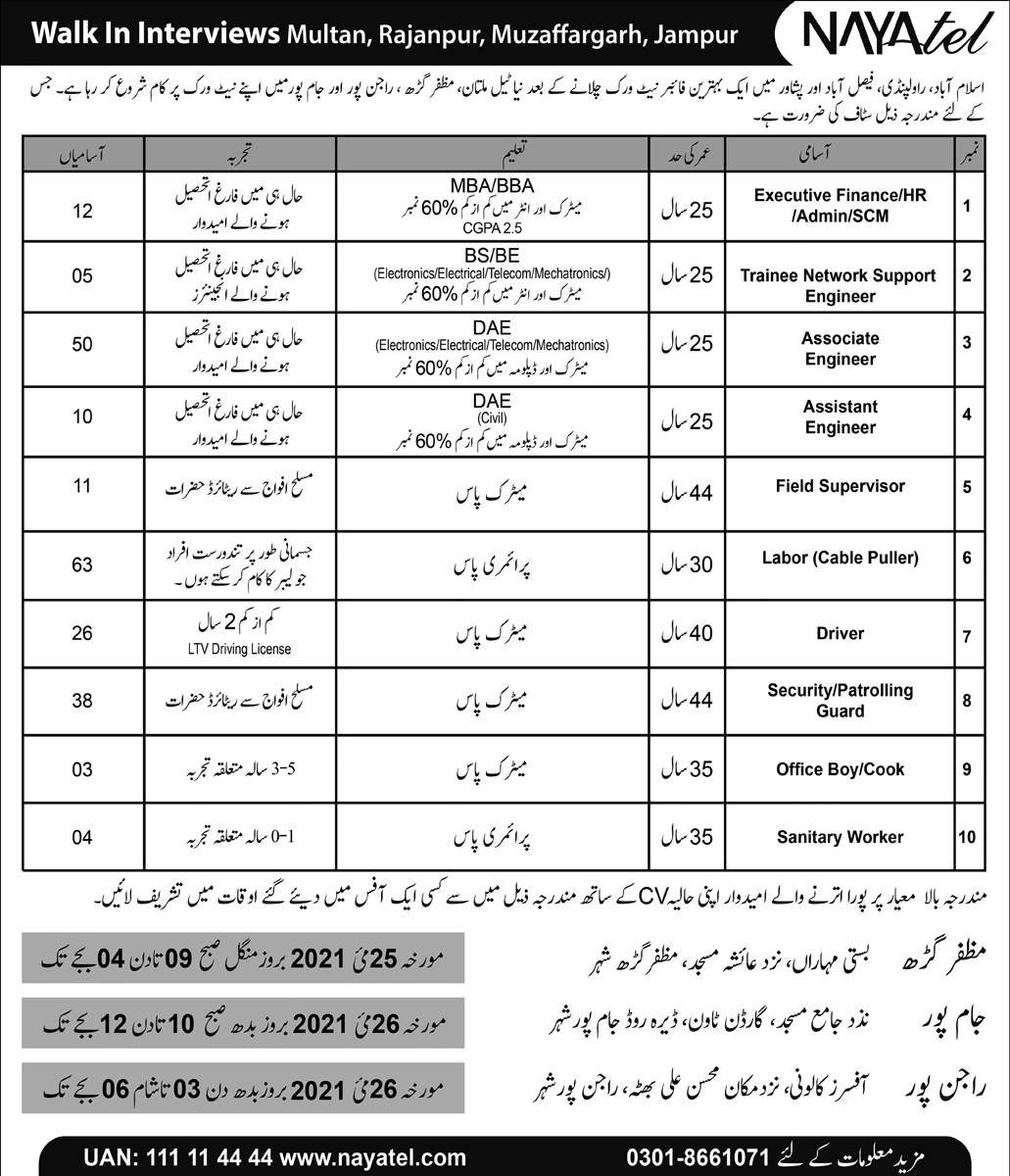 Nayatel Pvt Limited is hiring Executive Finance, HR, Admin, SCM, Trainee Network Support Engineer, Assistant Engineer, Field Supervisor, Labor, Driver, Security Patrolling Guard, Office Boy, Cook, Sanitary Worker in Islamabad, Rawalpindi, Faisalabad and Peshawar.