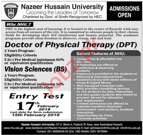 Nazeer Hussain University Chartered by Government of Sindh recognized by HEC Higher Education Commission offers admissions for Doctor of Physical Therapy DPT & Vision Sciences BS in Karachi. Read newspaper ad for exact details.