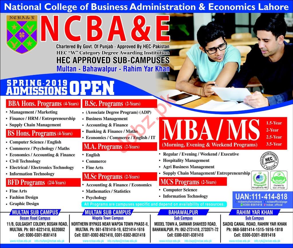 NCBA&E National College of Business administration & Economics Multan, Pakistan are opened admissions spring 2019 for the classes of BS Hons, BBA, MBA, M Sc, MA, MS, MCS and BFD. Read newspaper ad for exact details.