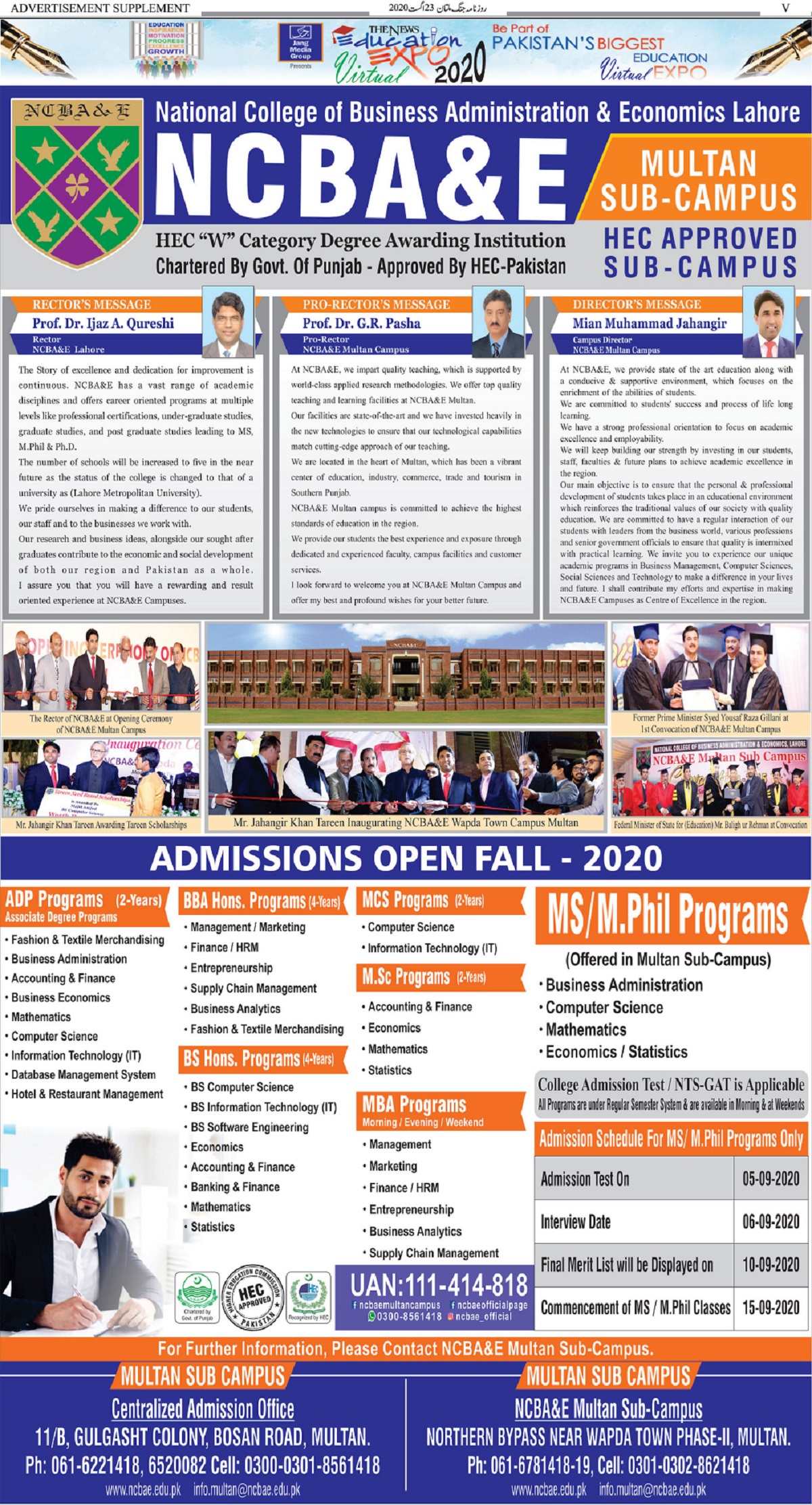 National College of Business Administration & Economics NCBA & E Multan Sub Campus invited applications for admissions in ADP, BBA Hons, BS Hons, MCS, MSc, MBA, MS, M.Phil Programs. Read newspaper ad for exact details.