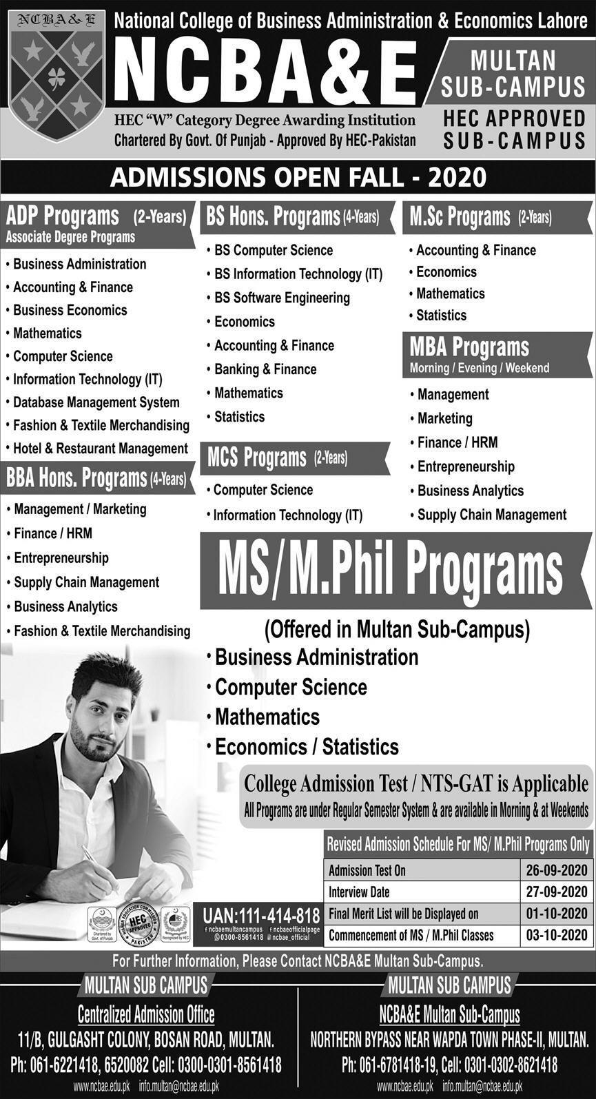 National College of Business Administration & Economics NCBA&E is offering admissions in ADP, BBA Hons, BS Hons, MCS, MSc, MBA, MS, M.Phil Degree Programs. Read newspaper ad for exact details.