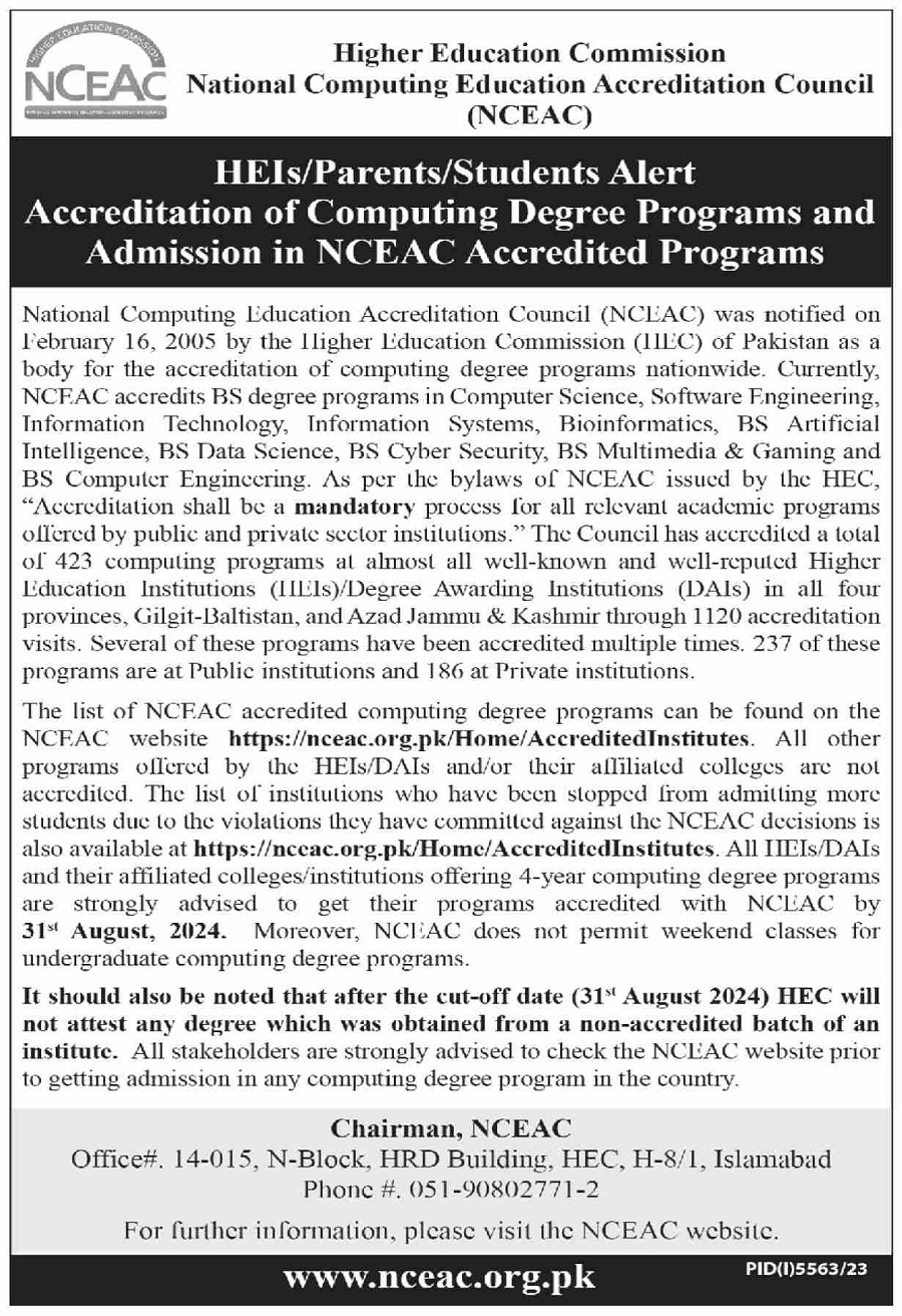 Admissions in National Computing Education Accreditation Council NCEAC 2024 for NCEAC Program has been announced. National Computing Education Accreditation Council NCEAC Islamabad Islamabad Pakistan welcomes students to apply for admissions in academic year 2024 in Science University. Eligible students for fulfilling criteria for admissions in Bachelor and BS can enroll as per Government admission policy 2024 till closing date 17 June 2024. Read newspaper ad for exact details.