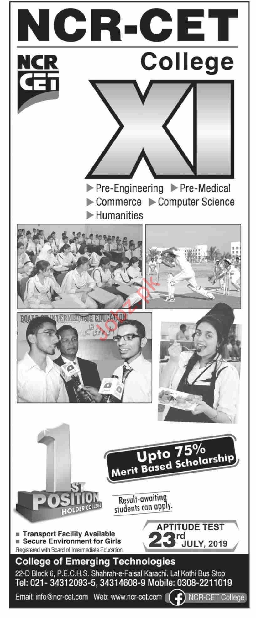 NCR CET College of Emerging Technologies Karachi, Pakistan are started admissions fall 2019 for the classes of FA Fine Arts & F Sc in Pre Medical and Pre Engineering, ICS. Read newspaper ad for exact details.