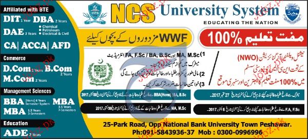 NCS University System Admission in DIT, DBA, CA, D.Com and MBA in Peshawar. Read newspaper ad for exact details.