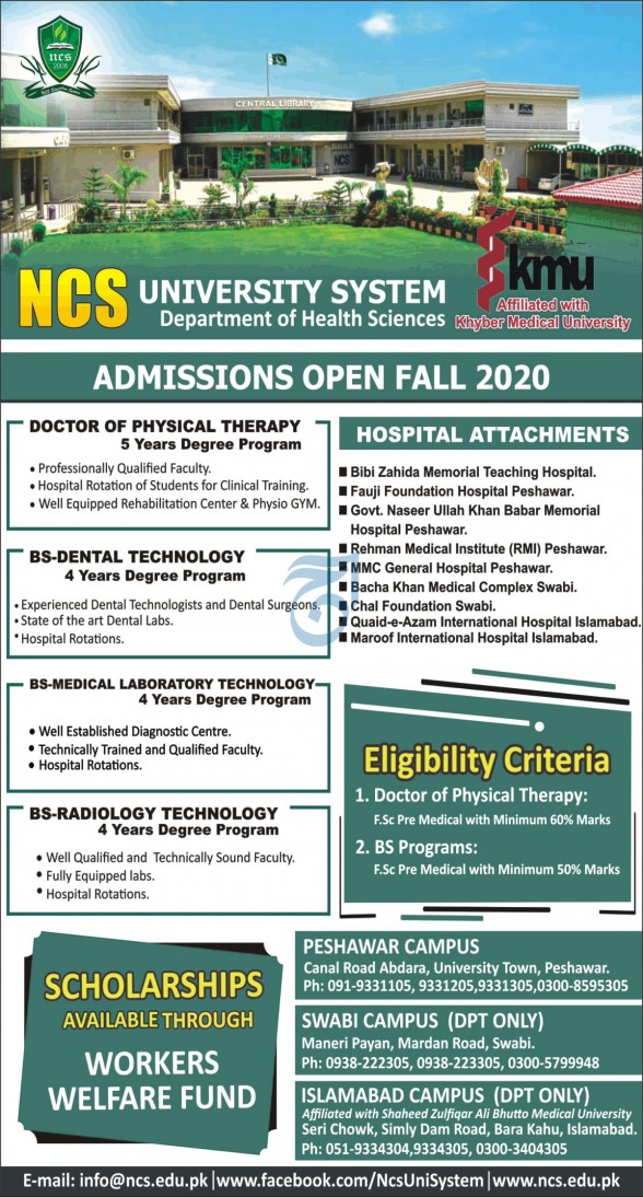 NCS University System, Department of Health Sciences has announced admissions in Doctor of Physical Therapy DPT, BS Dental Technology, BS Medical Laboratory Technology & BS Radiology Technology. Read newspaper ad for exact details.
