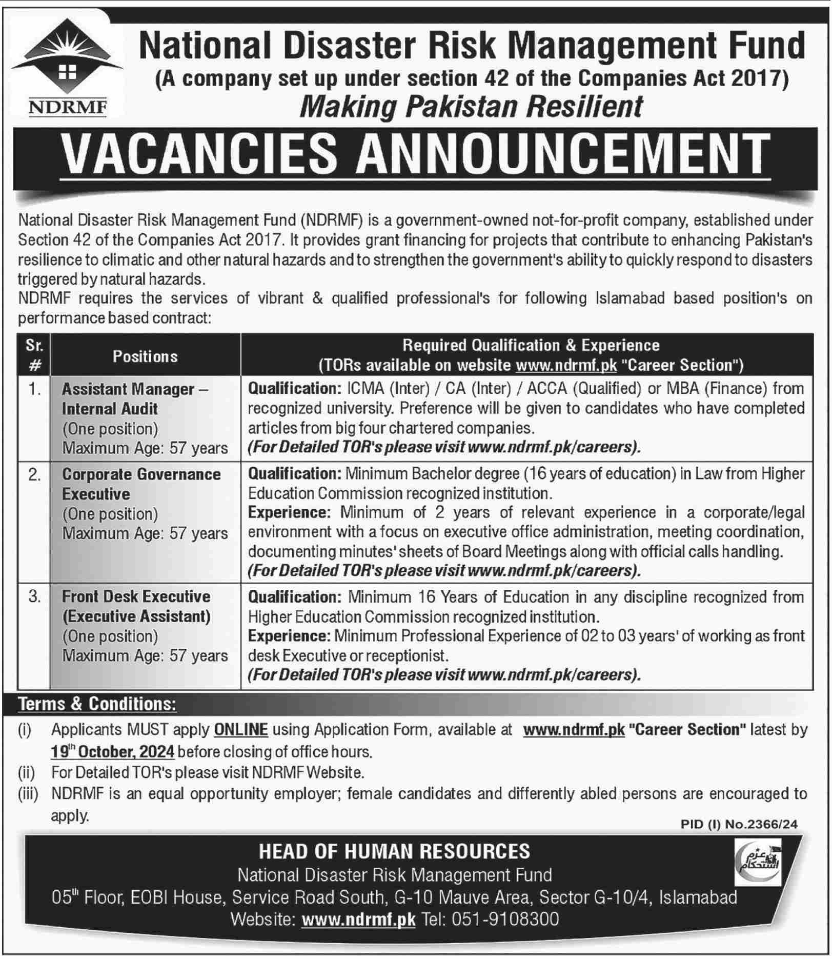 National Disaster Risk Management Fund NDRMF invites applications for job positions advertised in daily Dawn dated 5 October 2024 for following vacancies in Islamabad, islamabad Islamabad Pakistan.