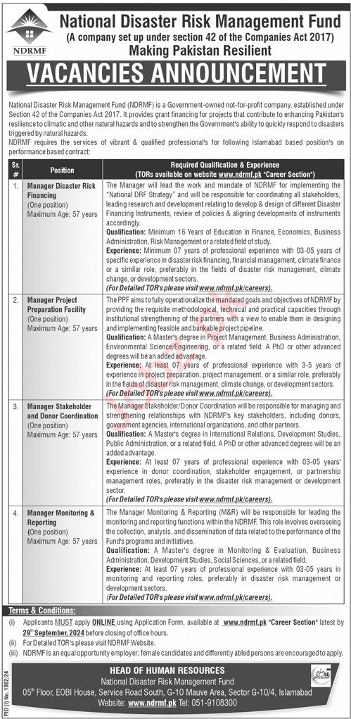 National Disaster Risk Management Fund NDRMF invites applications for job positions advertised in daily Jang dated 15 September 2024 for following vacancies in Islamabad, islamabad Islamabad Pakistan.