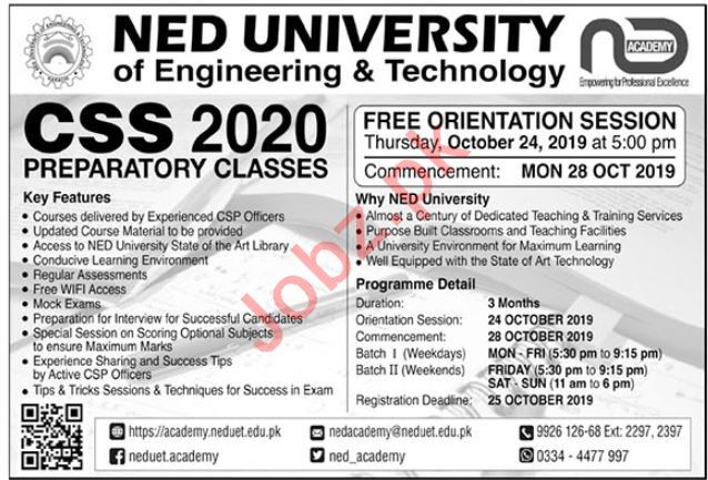 NED University of Engineering and Technology has announced admission in CSS 2020 Preparatory Classes in Karachi. Free orientation session will be held on October 24, 2019 Read newspaper ad for exact details.