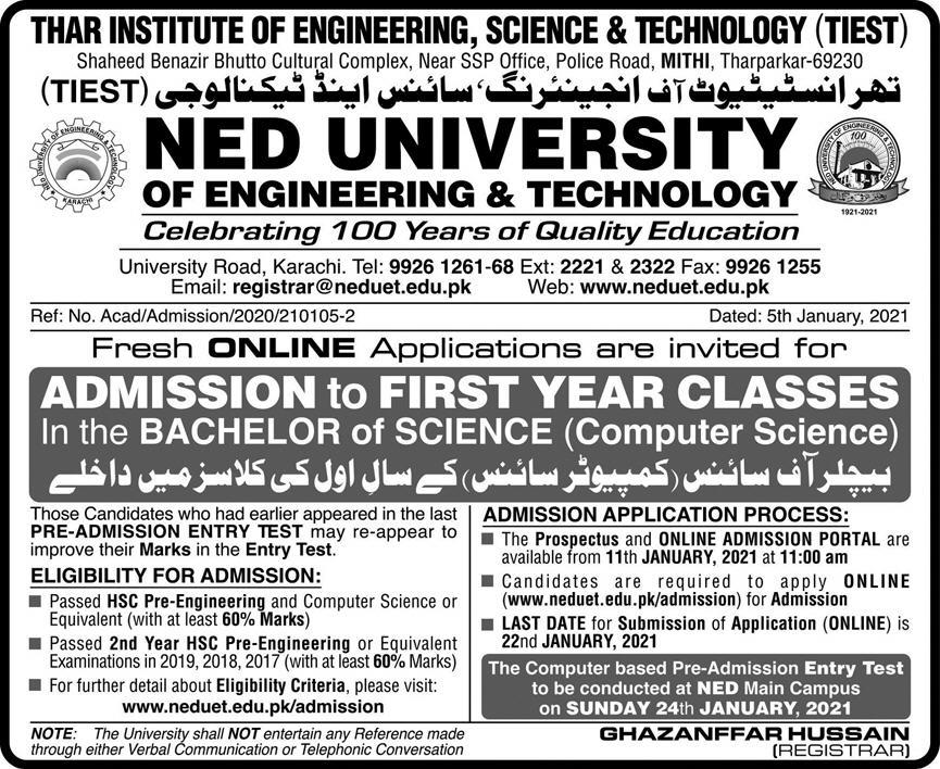 Thar Institute of Engineering, Science & Technology TIEST, NED University of Engineering and Technology invites applications for online admissions in Bachelor of Science Computer Science. Read newspaper ad for exact details.