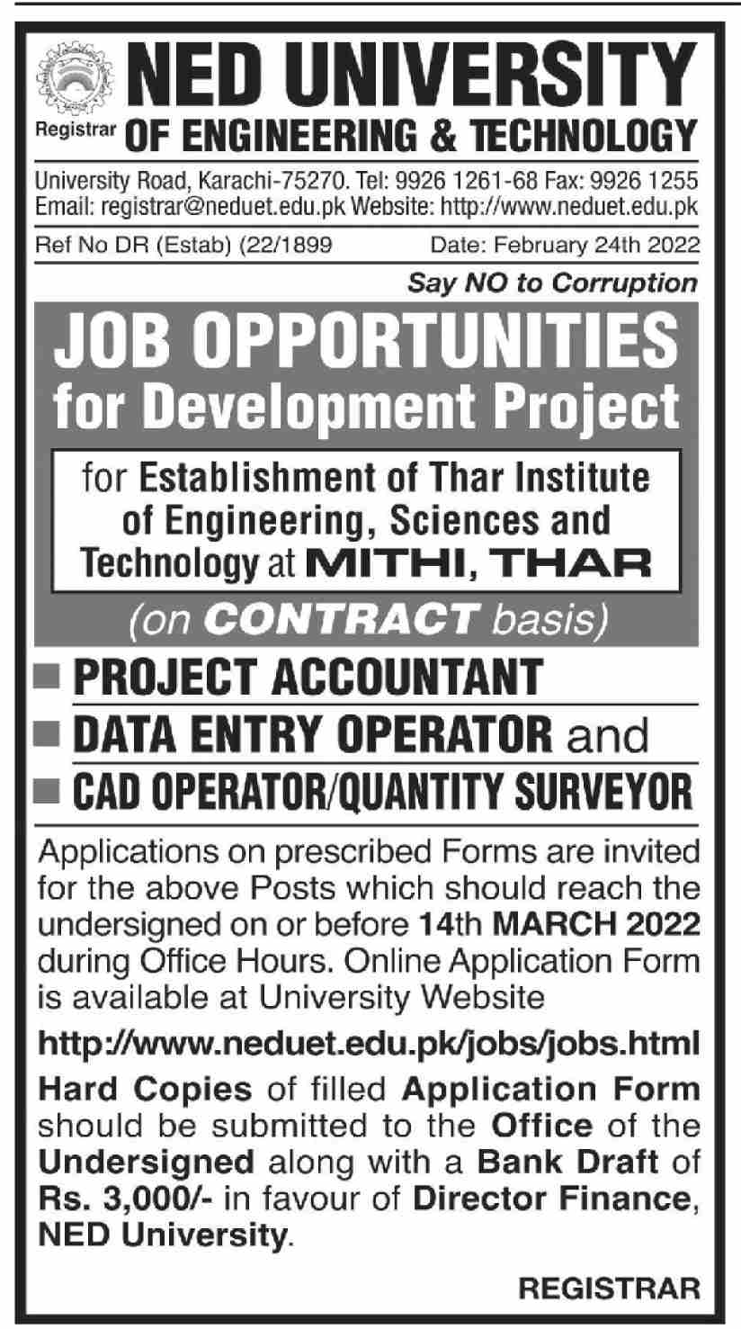 NED University of Engineering and Technology Mithi, mithi Sindh Pakistan invites applications from eligible candidates for the post of accountant, data entry operator, quantity surveyor and cad operator for establishment of Thar Institute of Engineering, Sciences and Technology as per advertisement of February 26, 2022 published in daily Dawn Newspaper. Persons with Master and Bachelor etc. education can apply.