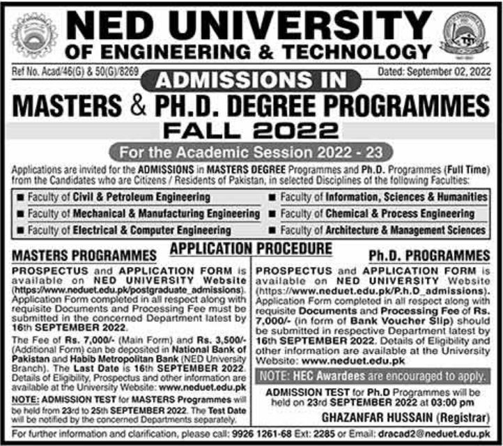 NED University of Engineering and Technology MS PhD Admissions 2022 23