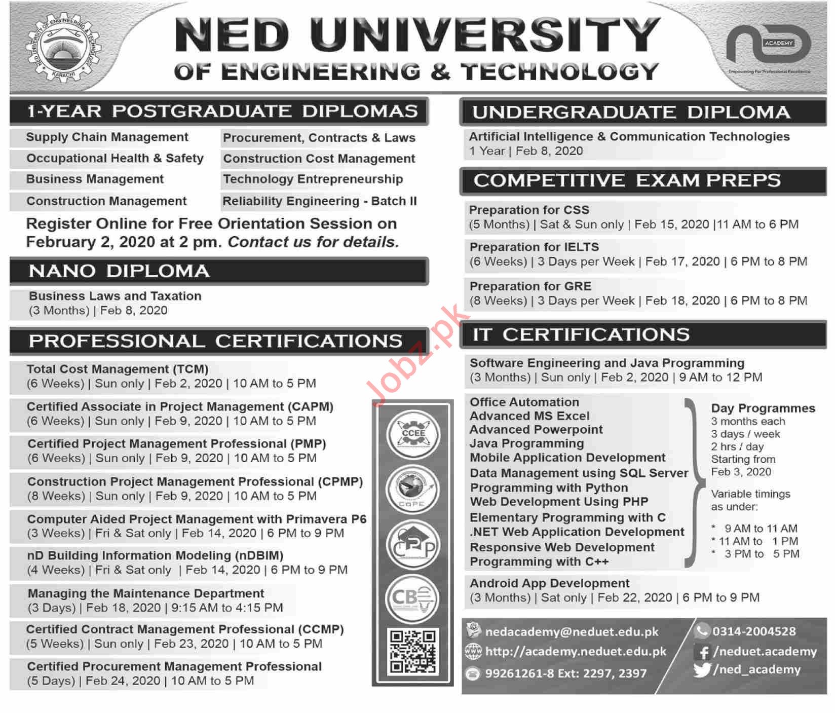 NED University of Engineering and Technology has announced admissions for 1 Year Postgraduate Diplomas, Undergraduate Diploma, Nano Diploma, Professional Certifications & IT Certifications in Karachi. Read newspaper ad for exact details.