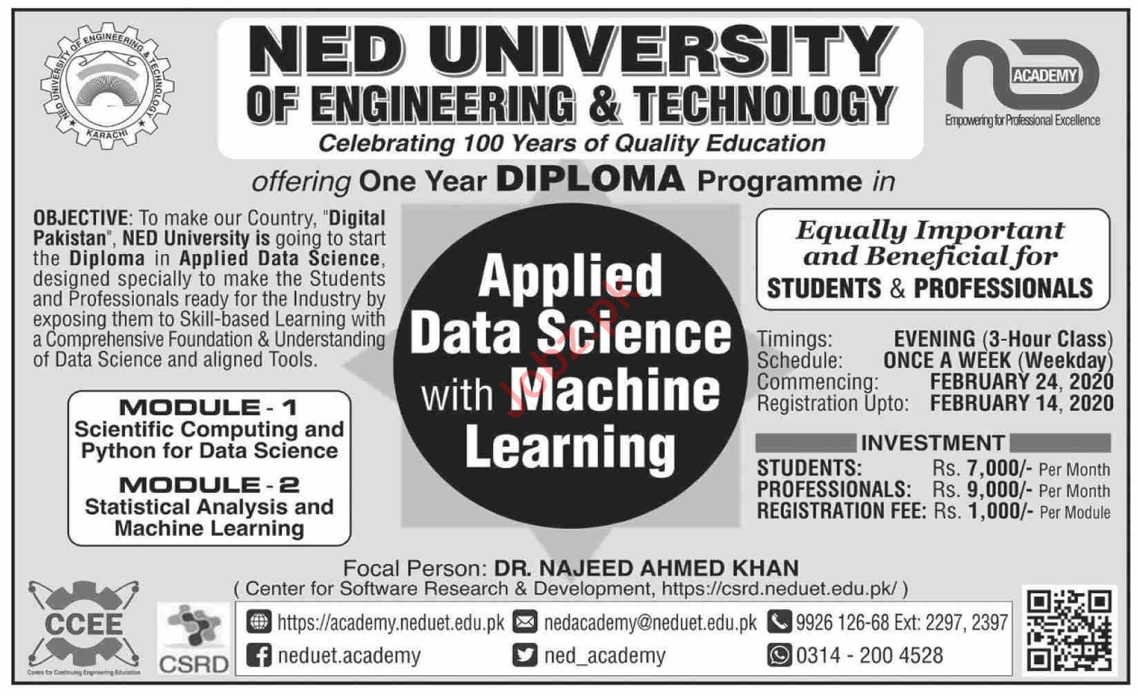 NED University of Engineering & Technology is offering admissions for Diploma Programme in Applied Data Science with Machine Learning in Karachi Sindh Pakistan 2020. Read newspaper ad for exact details.