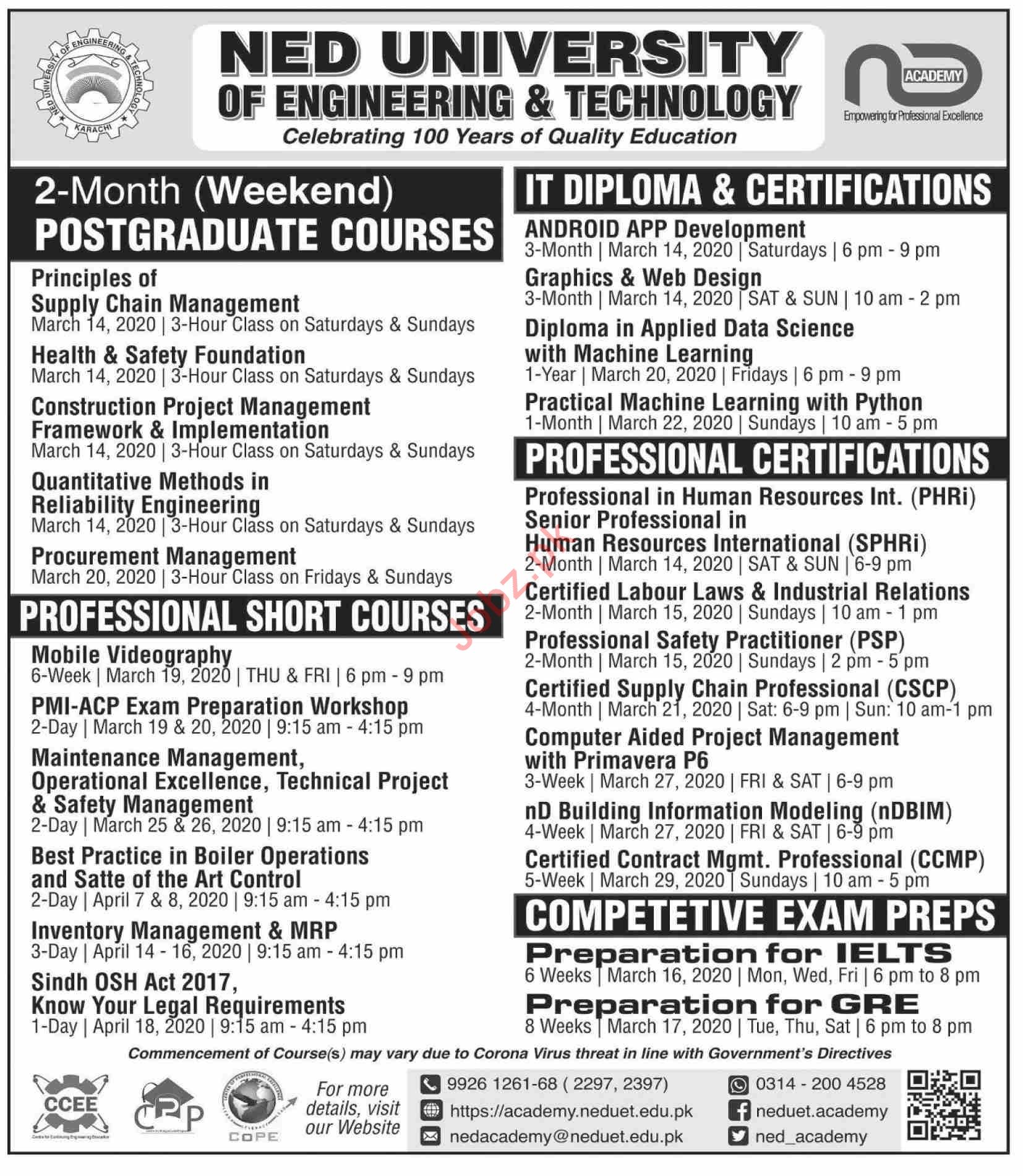 NED University of Engineering & Technology invites applications for admissions in Postgraduate Courses, IT Diploma & Certifications, Professional Short Courses & Professional Certifications. Read newspaper ad for exact details.