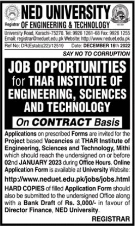 Vacancies in NED University of Engineering and Technology Advertisement December 2022