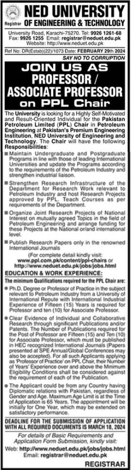 Vacant posts including professor and associate professor are announced in NED University of Engineering and Technology Karachi, karachi Sindh Pakistan as per 1 March 2024 advertisement in daily Jang Newspaper. Preferred Education is Master, Bachelor, Mphil and Phd etc.