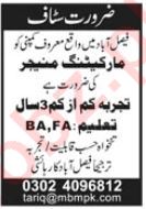 Vacant posts including marketing manager are announced in Private Company Faisalabad, faisalabad Punjab Pakistan as per 15 May 2023 advertisement in daily Jang Newspaper. Educational qualifications required Intermediate, BA and Bachelor etc.