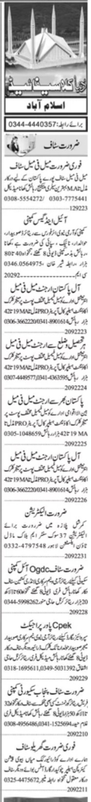 Private Company Islamabad, islamabad Islamabad Pakistan invites applications from eligible candidates for the post of female staff, accountant, electrician, call operator, clerk, manager, helepr, chowkidar, driver, retired staff and male staff as per advertisement of September 20, 2022 published in daily Dunya Newspaper. Candidates with Matric, Bachelor, Intermediate and Middle etc. educational background will be preferred.