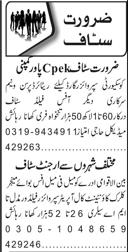 Private Company jobs advertisement dated about 26 December 2023 in daily Roznama 92 News Newspaper invites application for the vacant post of security supervisor, female staff, helper, supervisor, accountant, male staff, manager, call operator and clerk in Lahore, lahore Punjab Pakistan. Persons with Intermediate, Bachelor, Middle and Matric etc. education can apply.
