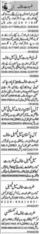 Private Organization Lahore, lahore Punjab Pakistan invites applications from eligible candidates for the post of helepr, manager, accountant, female staff, security supervisor, computer operator, male staff, clerk and call operator as per advertisement of October 19, 2022 published in daily Dunya Newspaper. Preferred Education is Middle, Matric, Bachelor, Master and Intermediate etc.