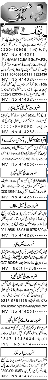 Private Institute Peshawar, peshawar Khyber Pakhtunkhwa KPK Pakistan invites applications from eligible candidates for the post of female teacher, urdu teacher, chemistry teacher, physics teacher, math teacher, male teacher, english teacher, biology teacher and pak study teacher as per advertisement of October 15, 2022 published in daily Aaj Newspaper. Candidates with MS, Master and Bachelor etc. educational background will be preferred.