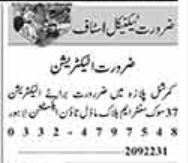 Private Organization Lahore, lahore Punjab Pakistan invites applications from eligible candidates for the post of electrician as per advertisement of September 20, 2022 published in daily Dunya Newspaper. Primary, Middle and Matric etc. educational qualification will be preferred.