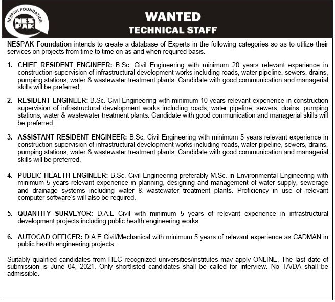 Vacancies in Nespak Foundation Advertisement May 2021