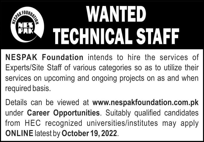 Nespak Foundation jobs advertisement dated about 5 October 2022 in daily Nawaiwaqt Newspaper invites application for the vacant post of technical staff in Lahore, lahore Punjab Pakistan. Candidates with Middle, Matric, Master and Intermediate etc. educational background will be preferred.