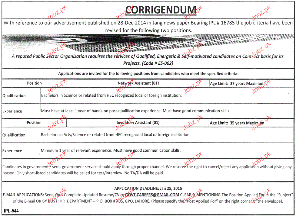 Apply as per details in job advertisement. Login to view further details of how to apply via https://www.jobz.pk online.