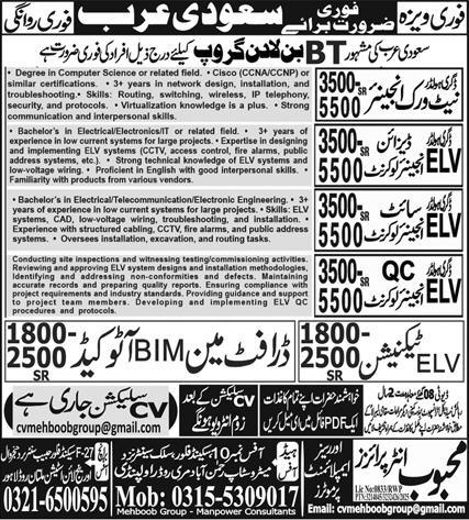 Vacant posts including draftsman bim autocad, elv engineer, network engineer, elv design engineer low current, elv technician, elv qc engineer low current, elv engineer low current, elv site engineer low current, draftsman, elv site engineer and site elv engineer low current are announced in Mehboob Enterprises Overseas Employment Promoters Riyadh, dammam Saudi Arabia as per 1 August 2025 advertisement in daily Express Newspaper. Persons with Others, Bachelor, DAE, Intermediate and B.E etc. education can apply.