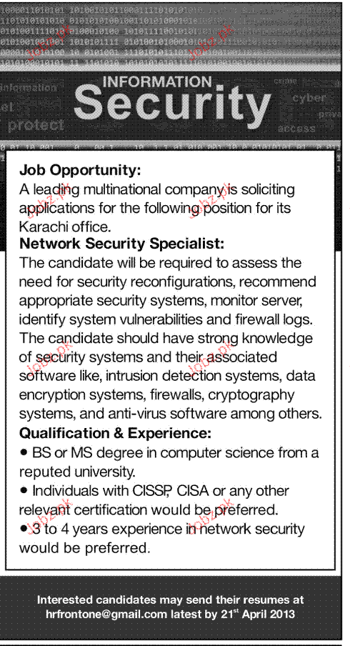 Apply as per details in job advertisement. Login to view further details of how to apply via https://www.jobz.pk online.