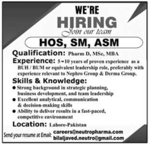Neutro Pharma Pvt Limited is looking for candidates for following posts as per job advertisement published in daily Jang Newspaper of December 14, 2025 for location Lahore, lahore Punjab Pakistan: