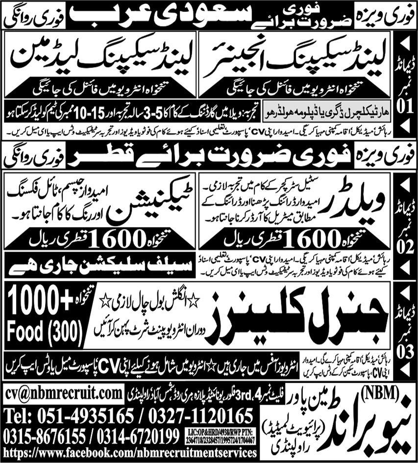 Vacant posts including general cleaner, technician, welder, land skipping leadman and land skipping engineer are announced in New Brand Manpower Riyadh, riyadh Saudi Arabia as per 5 March 2024 advertisement in daily Express Newspaper. Preferred Education is Matric, Intermediate, Middle and Bachelor etc.