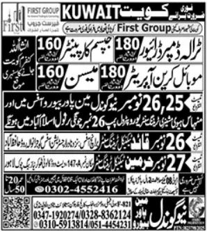 Vacant posts including gypsum carpenter, traila dumper driver, mobile crane operator, driver and mason are announced in New Gondal Manpower Bureau Kuwait, kuwait Kuwait as per 25 November 2025 advertisement in daily Dunya Newspaper. Persons with Primary, Matric and Middle etc. education can apply.