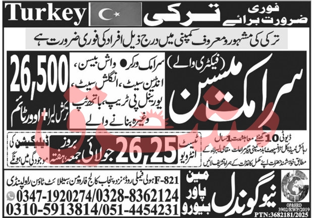 New Gondal Manpower Bureau is looking for candidates for following posts as per job advertisement published in daily Mashriq Newspaper of July 24, 2025 for location Istanbul, istanbul Turkey: