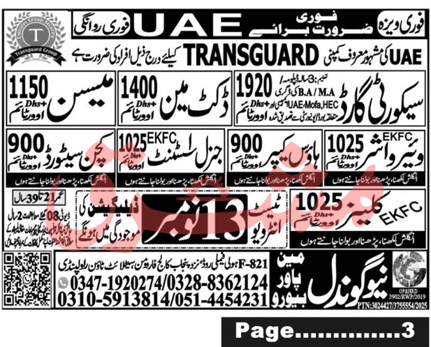 New Gondal Manpower Bureau jobs advertisement dated about 13 November 2025 in daily Mashriq Newspaper invites application for the vacant post of mason, general assistant, security guard, house keeper, cleaner, ductman, ware washer and kitchen steward in Abu Dhabi, abu dhabi UAE. Educational qualifications required Primary, Intermediate, Matric and Middle etc.