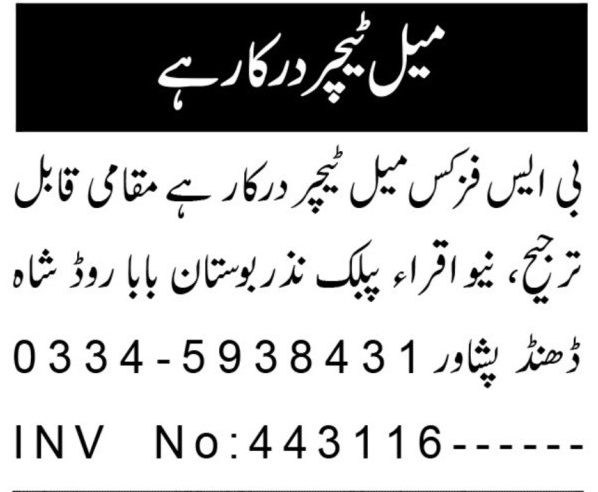 New Iqra Public School Peshawar, peshawar Khyber Pakhtunkhwa KPK Pakistan invites applications from eligible candidates for the post of physics teacher and teacher as per advertisement of August 14, 2025 published in daily Aaj Newspaper. Preferred Education is Master and Bachelor etc.