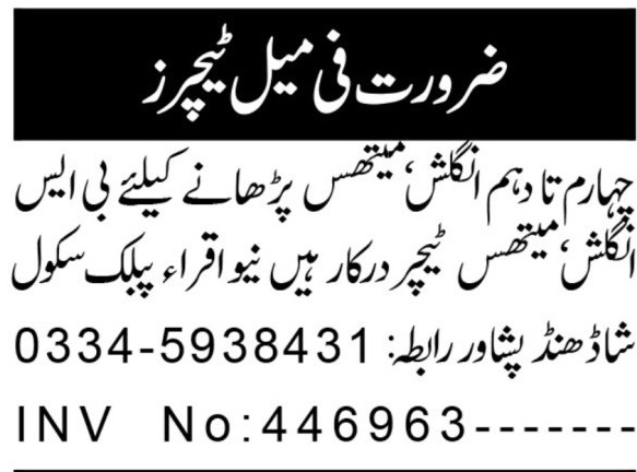 New Iqra Public School Peshawar, peshawar Khyber Pakhtunkhwa KPK Pakistan invites applications from eligible candidates for the post of english teacher, mathematics teacher and teacher as per advertisement of November 12, 2025 published in daily Aaj Newspaper. Educational qualifications required Master, Bachelor and Others etc.