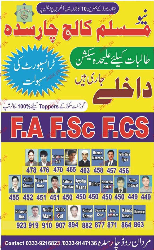 New Muslim College Admission in FA, Fsc and Fcs in Charsadda. Read newspaper ad for exact details.