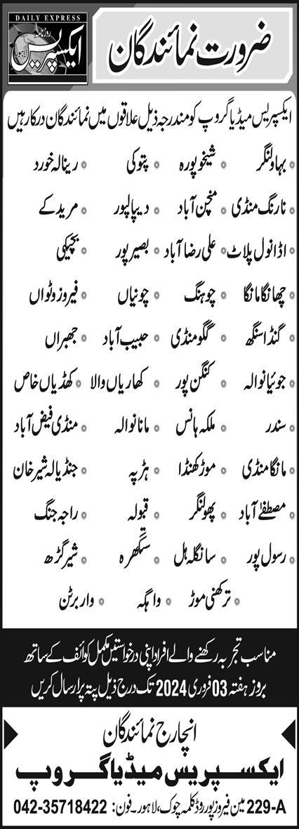 Express Media Group jobs advertisement dated about 30 January 2024 in daily Express Newspaper invites application for the vacant post of reporter in Bahawalpur, pattoki, muridke, bahawalpur, lahore, sheikhupura, minchinabad, depalpur and renala khurd Punjab Pakistan. Educational qualifications required Bachelor and Master etc.