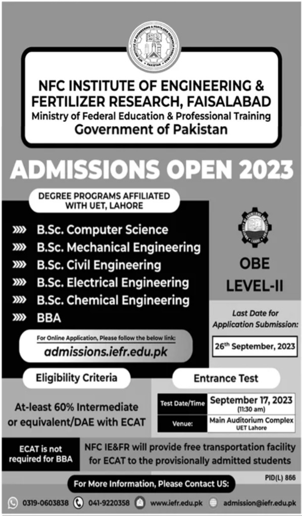 Admissions in NFC Institute of Engineering & Technology 2023 for BSc, BBA Depgree Program has been announced. Students can enroll for admissions in NFC Institute of Engineering & Technology Multan Punjab Pakistan for academic year 2023 to continue campus based or online education in Science College. Eligible candidates for admissions in BSc Hons and BBA can apply as per Government institute criteria and before closing date 17 September 2023 after reading advertisement online. Read newspaper ad for exact details.