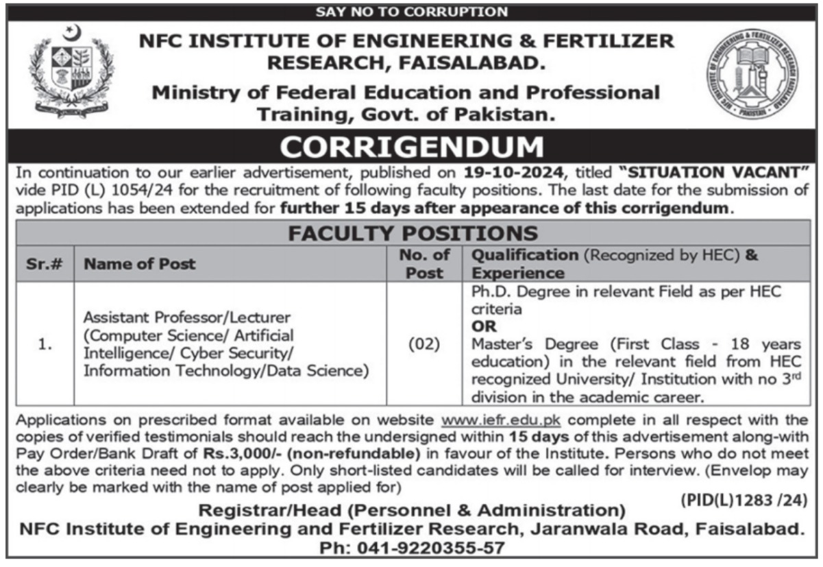 Vacancies in NFC Institute of Engineering and Fertilizer Research Advertisement November 2024