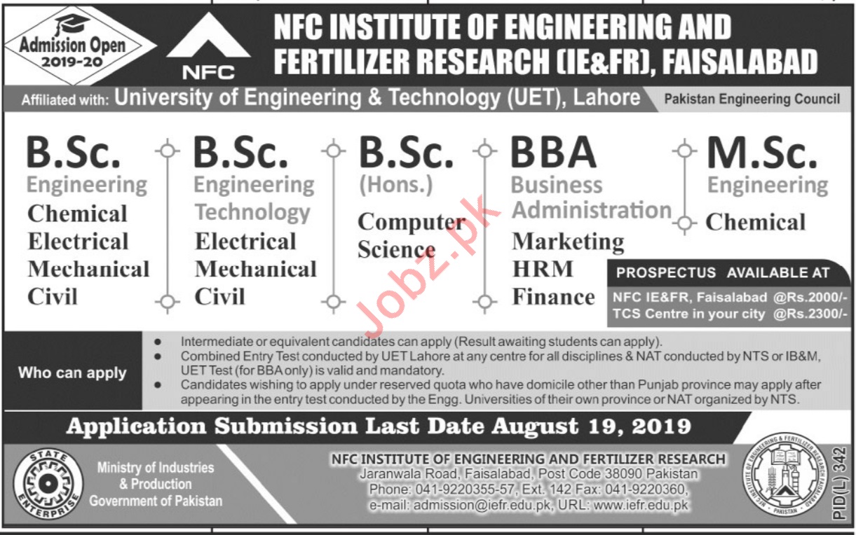 NFC Institute of Engineering & Fertilizer Research has announced admissions in B.Sc Engineering in Chemical, Electrical, mechanical, Civil, B.Sc Engineering Technology in Electrical, Mechanical, Civil, B.Schons Computer Science, BBA. M.Sc Engineering in Chemical in Faisalabad. Read newspaper ad for exact details.