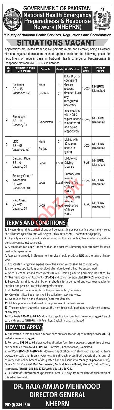 National Health Emergency, Preparedness and Response Network NHEPRN Government of Pakistan Ministry of National Health Services Regulations & Coordination NHSRC intends to hire qualified and experienced candidates for the posts of Assistant, Steno Typist, Lower Division Clerk, LDC, Dispatch Rider, Chowkidar, Security Guard and Naib Qasid in Islamabad through Open Testing Services OTS 2019.