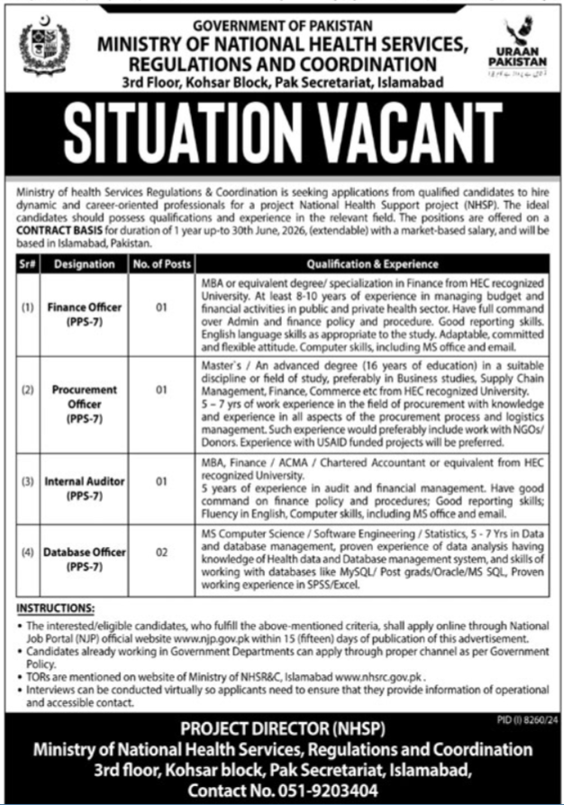 Vacancies in Ministry of National Health Services Regulations & Coordination NHSRC Advertisement May 2025