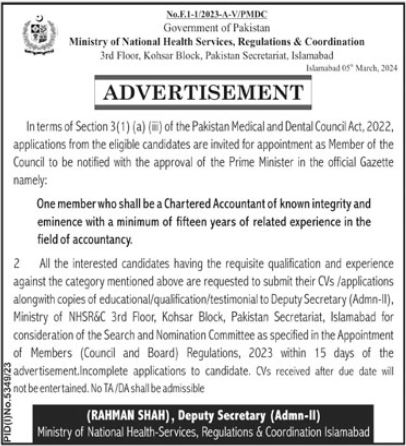Vacant posts including member are announced in Ministry of National Health Services Regulations & Coordination NHSRC Islamabad, islamabad Islamabad Pakistan as per 8 March 2024 advertisement in daily Jang Newspaper. Candidates with MS, Bachelor and Master etc. educational background will be preferred.
