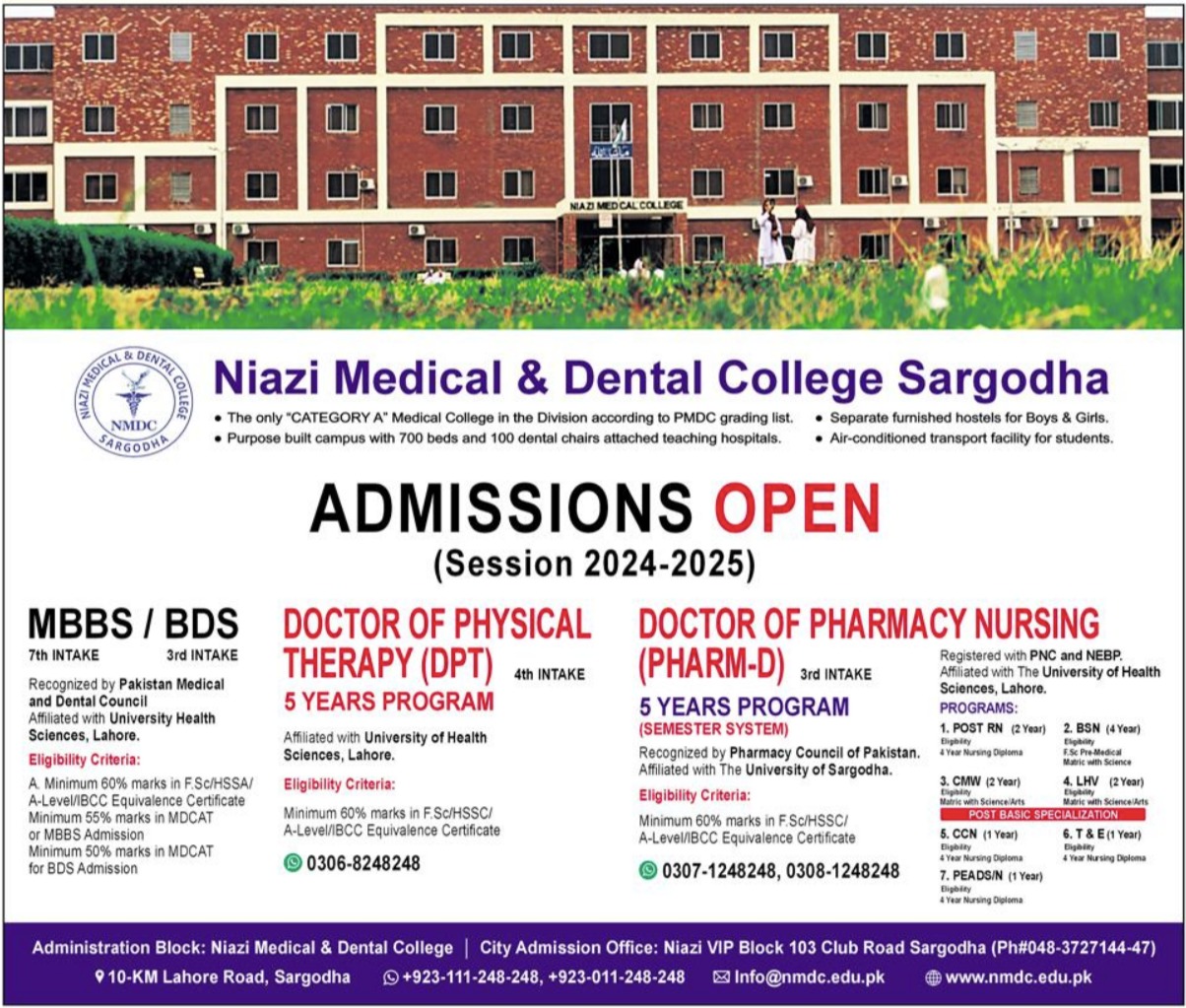 Niazi Medical & Dental College admissions 2024 for Doctor of Physical Therapy, Doctor of Pharmacy Nursing has been announced. Students can enroll for admissions in Niazi Medical & Dental College Sargodha Punjab Pakistan for academic year 2024 to continue campus based or online education in Medical University. Students for admissions in Pharm D, MBBS and BDS can apply for online or campus classes as per Private institute criteria till admission closing date August 31, 2024. Read newspaper ad for exact details.