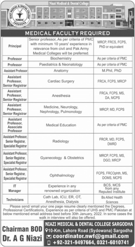 Niazi Medical & Dental College jobs advertisement dated about 16 January 2022 in daily Jang Newspaper invites application for the vacant post of professor, registrar, it manager, principal, technician and assistant professor in Sargodha Punjab Pakistan. Preferred Education is Bachelor and MBBS etc.
