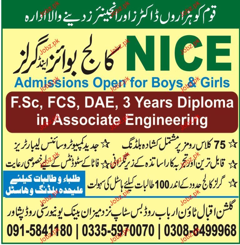 NICE College For Boys and Girls Admission in FSc and DAE in Peshawar. Read newspaper ad for exact details.