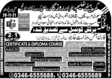 NICON Training Institute Islamabad is offering the best opportunity to skilled persons to get online diploma and certificates on the basis of their skills from British Council. Read newspaper ad for exact details.